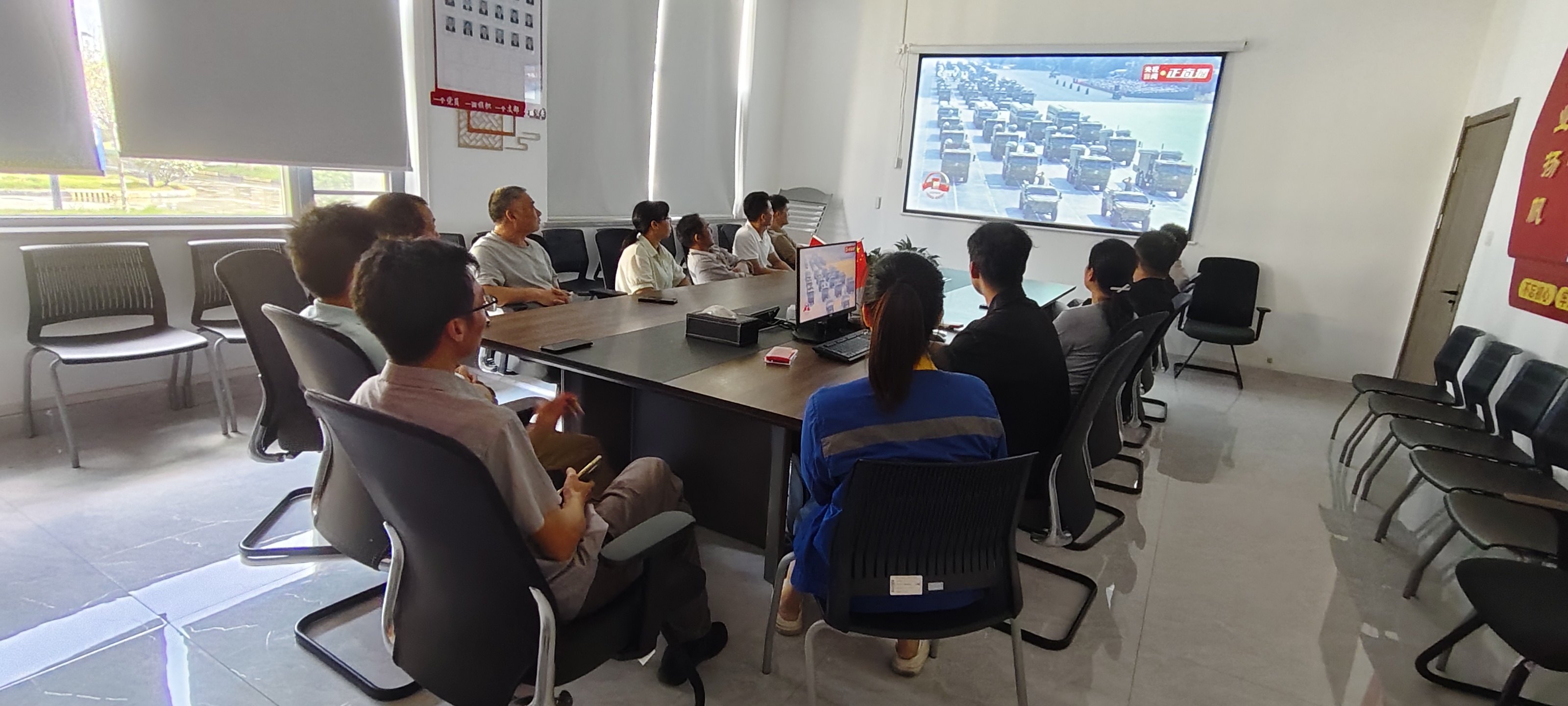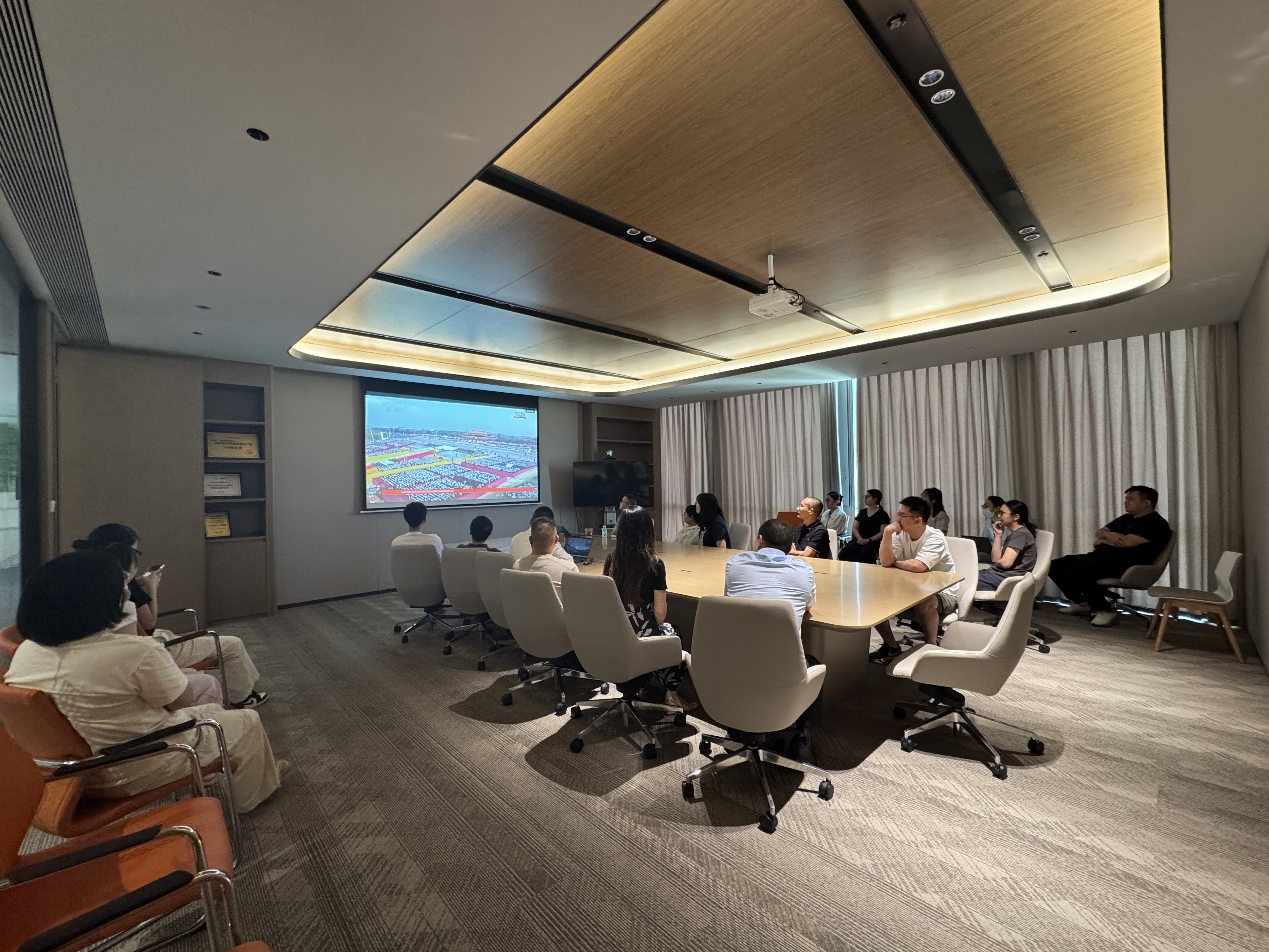 上午9時,大家準時聚集在各公司的會議室,自發(fā)整理好衣襟,眼神中滿是期待與肅穆。當直播畫面切到天安門廣場,鮮艷的五星紅旗在晨光中冉冉升起,激昂的歌聲里,是跨越代際的信仰傳承,是屬于京蘭人的集體共鳴。?